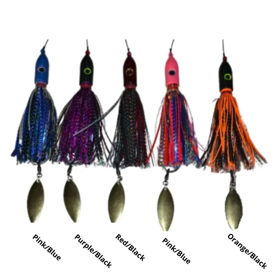 Based on the principle of a “Wahoo Bomb”, the JAG-A-HOO combines a trimmed down, compact version of Blue Water Candy’s most popular wahoo lures (JAG), and a large, gold spinner blade. Rigged on 275 lb. cable with an 9/0 Mustad® hook and terminated with a 900 lb. solid ring. The JAG-A-HOO is effective trolled both at slower and high speeds, from 5-12 kts. It also excels as a casting bait. The lure is held in place with a fixed crimp to ensure it does not slide up the leader, providing a perfect presentation each cast. Throw JAG-A-HOO to the horizon, let her sink, and crank like mad… you better be holding on!