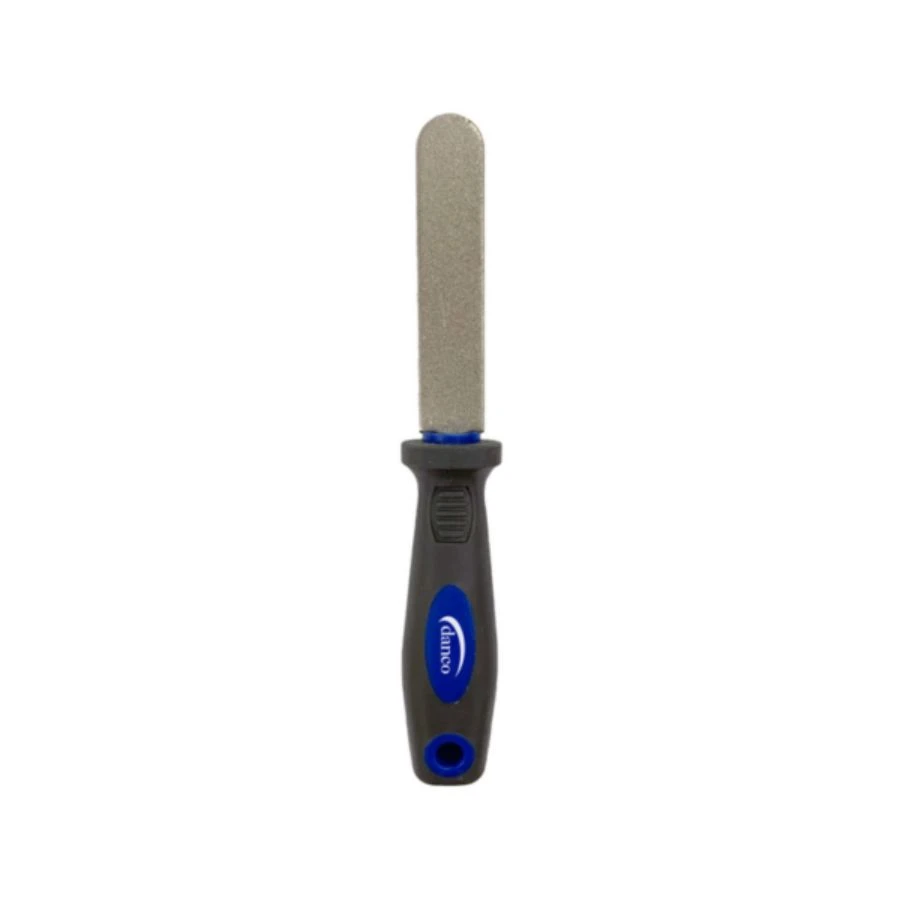 - Double sided diamond file has 400 and 600 grit surfaces with a hook channel
