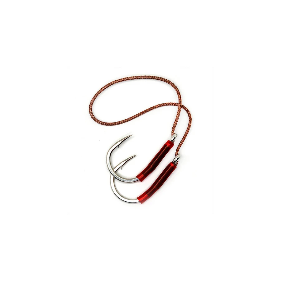 Gamakatsu’s Double Assist hooks are designed for fast and easy replacement on all types of butterfly, flat fall and “iron” jigs. The 6” super strong braided line loop can be adjusted to position each hook at the exact desired length, even or offset. Red heat shrink tubing on the hook shank is an added attractor and prevents chafing and bite-offs. Hooks are forged and barbed. Available in 2/0 and 4/0 in packages of two.